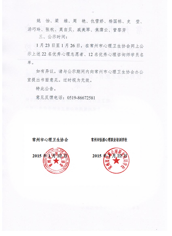 经常州市心理卫生协会、常州市心理卫生协会联合组织部分领导、专家对常州市心理卫生协会优秀心理志愿者候选名单、常州市心理卫生协会优秀学员候选名单进行票决,确定以下人员为优秀心理志愿者与优秀心理咨询师学员,先将名单公示如下: