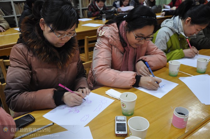 第二环节,朱教授让女教师们在一张白纸的正面画一幅画来诠释幸福,然后在纸的反面按次序写出五个最能让你感受到幸福的人的名字。随后,朱教授对其中的几位女教师的所画所写进行了分析,如画笔颜色的选用、图画内容的选择等等,简单的分析却展示了丰富的阅历和对于幸福的深刻理解。朱教授着重和大家分享了常耀芬、钱柳云、王蕴芳、顾晓雪、张玲娜等老师的幸福感受;紧接着,朱教授带大家进行了精心策划的团体辅导游戏“幸福随我心”和心理剧“体验幸福”,大家先在舒缓轻柔的音乐中进行了放松训练,每个人都感觉到了放松后心灵的全新体验。