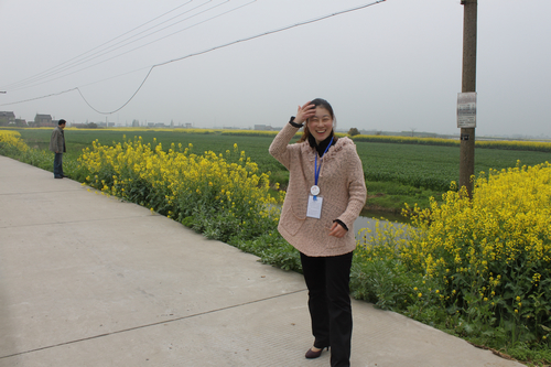 朱老师,戴主任和我们的孔老师站在油菜花地合影留念