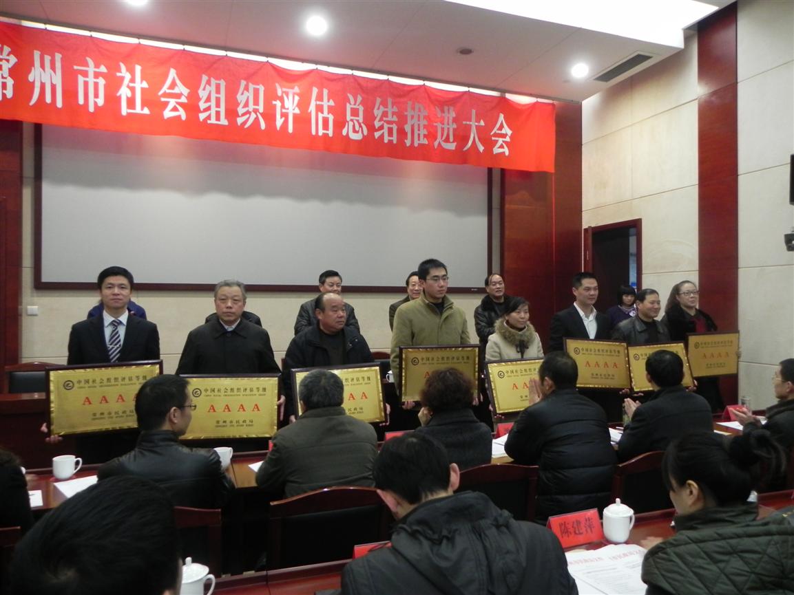 22日上午,市民政局在市行政中心召开了常州市社会组织评估总结推进会,会议由市民政局副局长潘奕主持。市民政局党委书记、局长戴士福、市经信委副主任徐靖德、市财政局副局长刘月东、市社科联副主席罗志平在主席台就座。会议中给予2012年度获得等级评估的14家社会组织进行了授牌表彰,其中获得4A级的有8家,获得3A级的有6家,2家4A级社会组织。