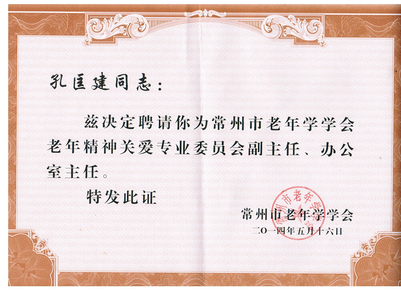 热烈祝贺朱坚同志被聘为常州市老年学学会副秘书长、老年精神关爱专业委员会主任;孔匡建同志被聘为常州市老年学学会老年精神关爱专业委员会副主任、办公室主任!