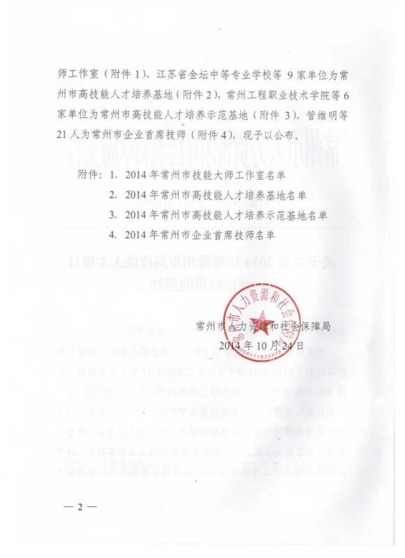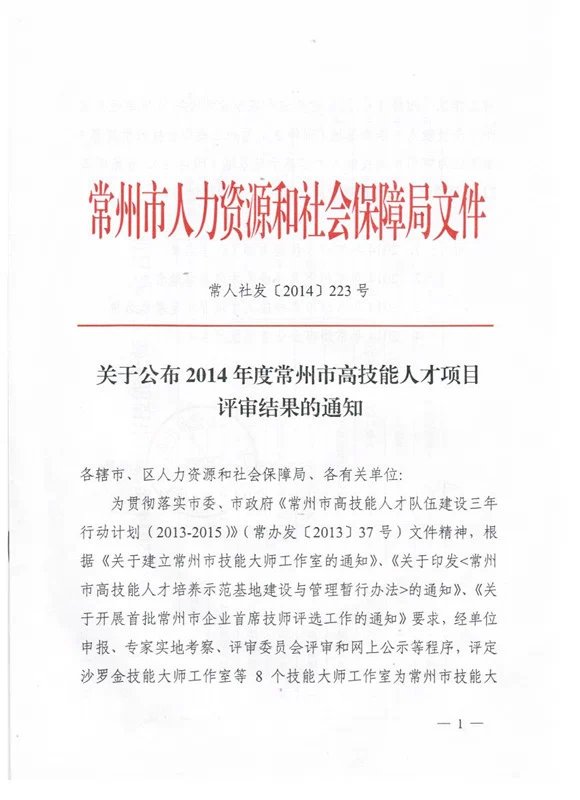 为贯彻落实市委、市政法规《常州市高技能人才队伍建设三年行动计划(2013-2015)》(常办发【2013】37号)文件精神,经单位申报、专家实地考察、评审委员会评审和网上公示等程序,评定了8个常州市技能大师工作室、9家常州市高技能人才培训基地、6家常州市高技能人才培养示范基地以及21位常州市企业首席技师。