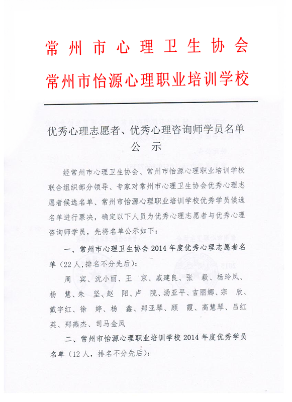 经常州市心理卫生协会、常州市心理卫生协会联合组织部分领导、专家对常州市心理卫生协会优秀心理志愿者候选名单、常州市心理卫生协会优秀学员候选名单进行票决,确定以下人员为优秀心理志愿者与优秀心理咨询师学员,先将名单公示如下: