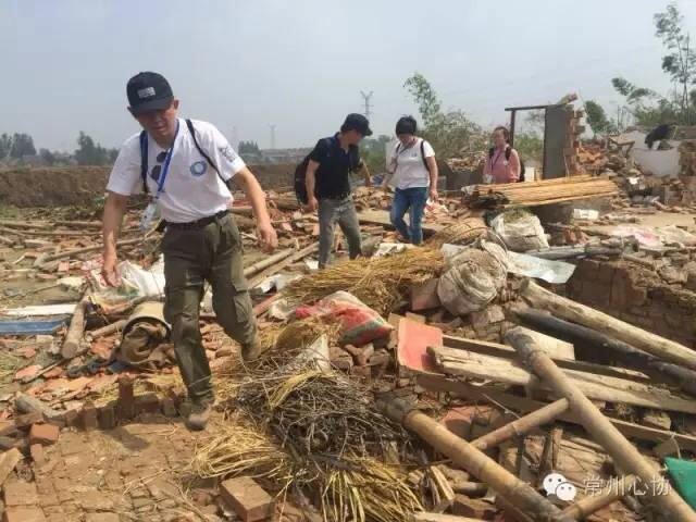 上午8点常州市红十字心理救援队心理干预志愿者克服道路崎岖,一路颠簸赶到受灾严重的新沟镇立新村,眼前一片狼藉,由于天气炎热,河水已经散发出淡淡臭味,志愿者们带去了爱心食品与灾民们分享。