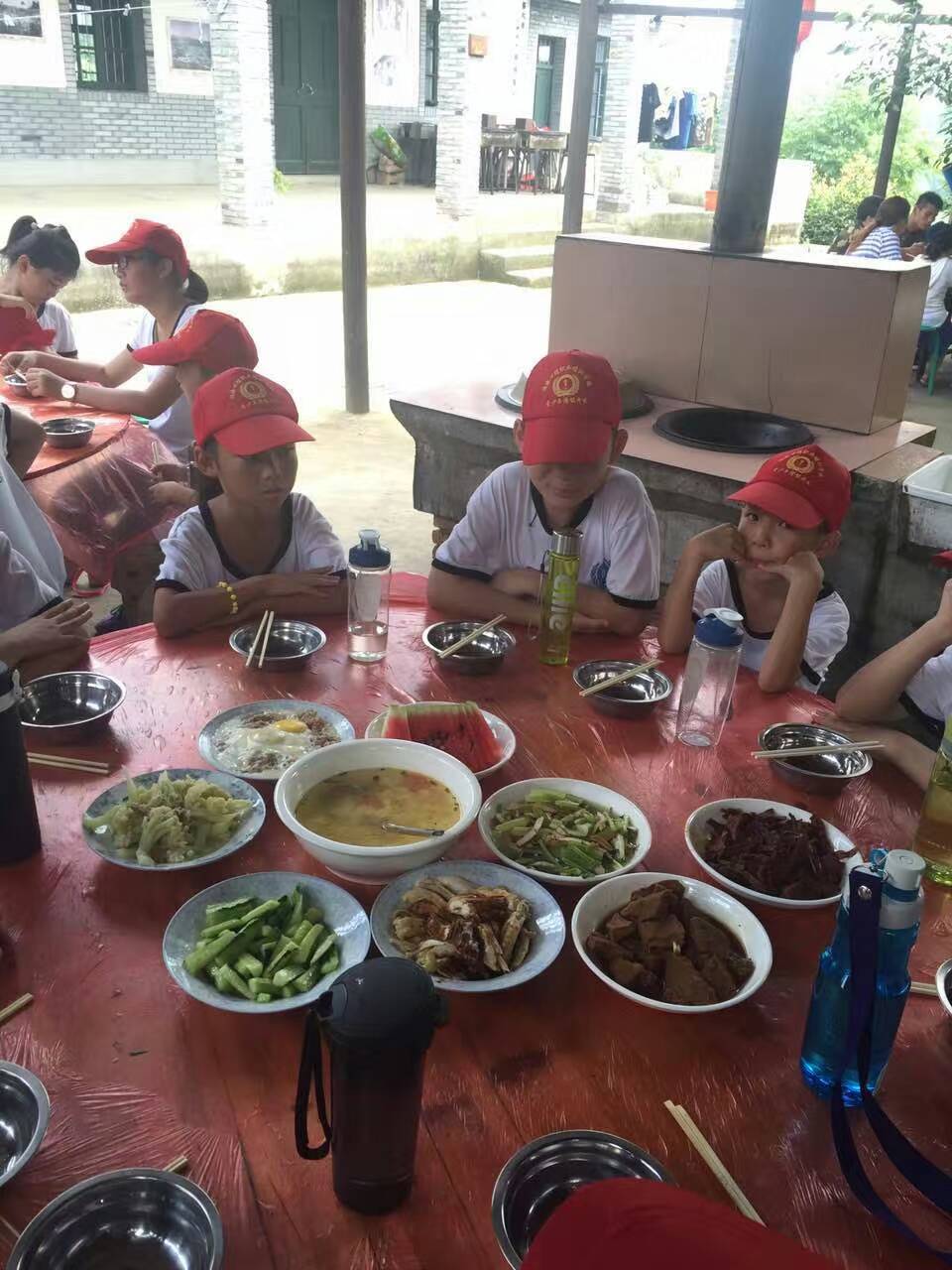 中午十点半我们顺利到达夏令营现场,稍作休息后开始用餐,孩子们一坐到饭桌上就不顾一切开始就吃,营地教练一声吼“全都不许动”[偷笑]教练说:要有规矩,不能乱抢,在教练的指导下孩子们规规矩矩整齐的吃完了午饭。
