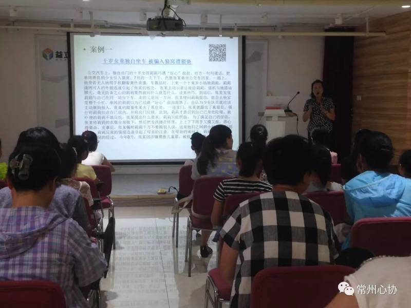 常州市心理卫生协会红梅工作站于2017年8月18日在“益立坊”参与了红梅街道卫计科举办的“关爱心连心 和美一家亲”幸福家庭系列活动,常州市心理卫生协会二级心理咨询师、常州市女社会心理工作者协会讲师王琰老师,来到红梅街道微公益巢活动室,为红梅街道辖区内10—15岁的女孩子及其家长们送上了《别让意外伤害你》为主题的心理健康讲座,许多家长特意请假来参加。