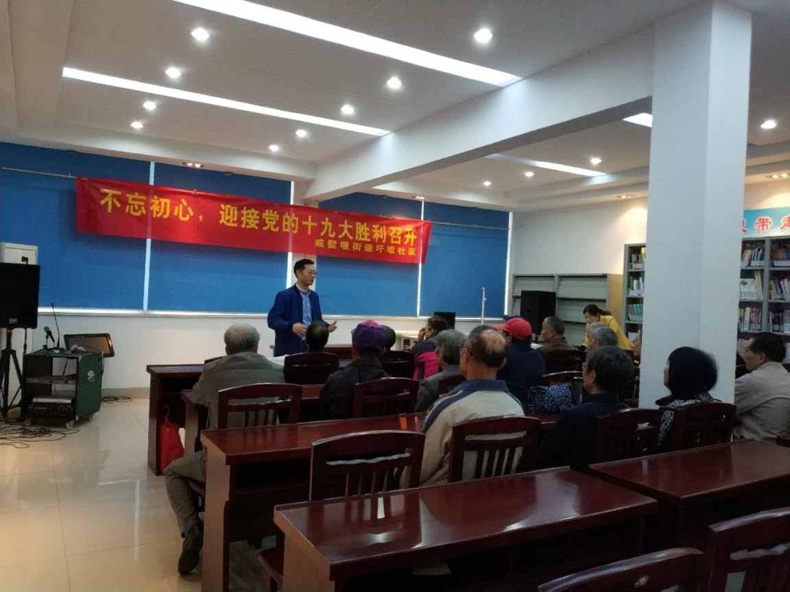 秋风送爽,金桂飘香,10月18日是党的十九大召开的日子。为喜迎党的十九大胜利召开,贯彻落实习近平总书记关于 “把弘扬孝亲敬老纳入社会主义核心价值观宣传教育,建设具有民族特色、时代特征的孝亲敬老文化”的重要讲话精神,圩墩社区诚邀常州市心理卫生协会组织一场关爱老年人心理健康讲座。