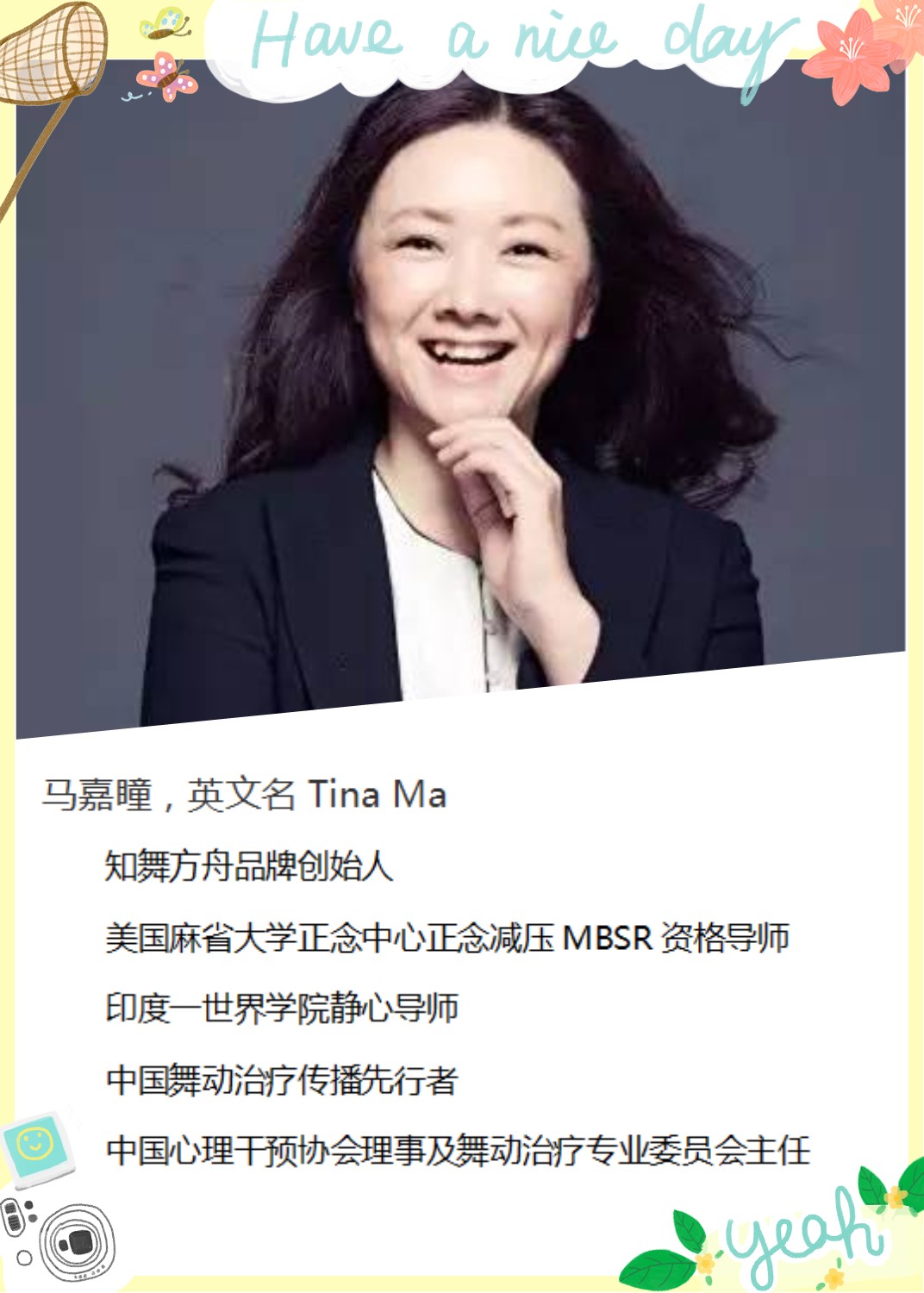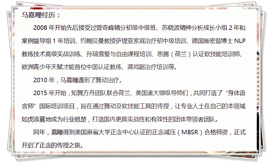 2017年12月,常州市心理卫生协会,常州市女社会心理工作者协会,朱坚技能大师工作室邀请马嘉瞳导师来常开办舞动静心工作室。工作坊重在培养学员觉知能力,为潜在的合一打下基础,在舞动与静心中,体验、探索、转化。