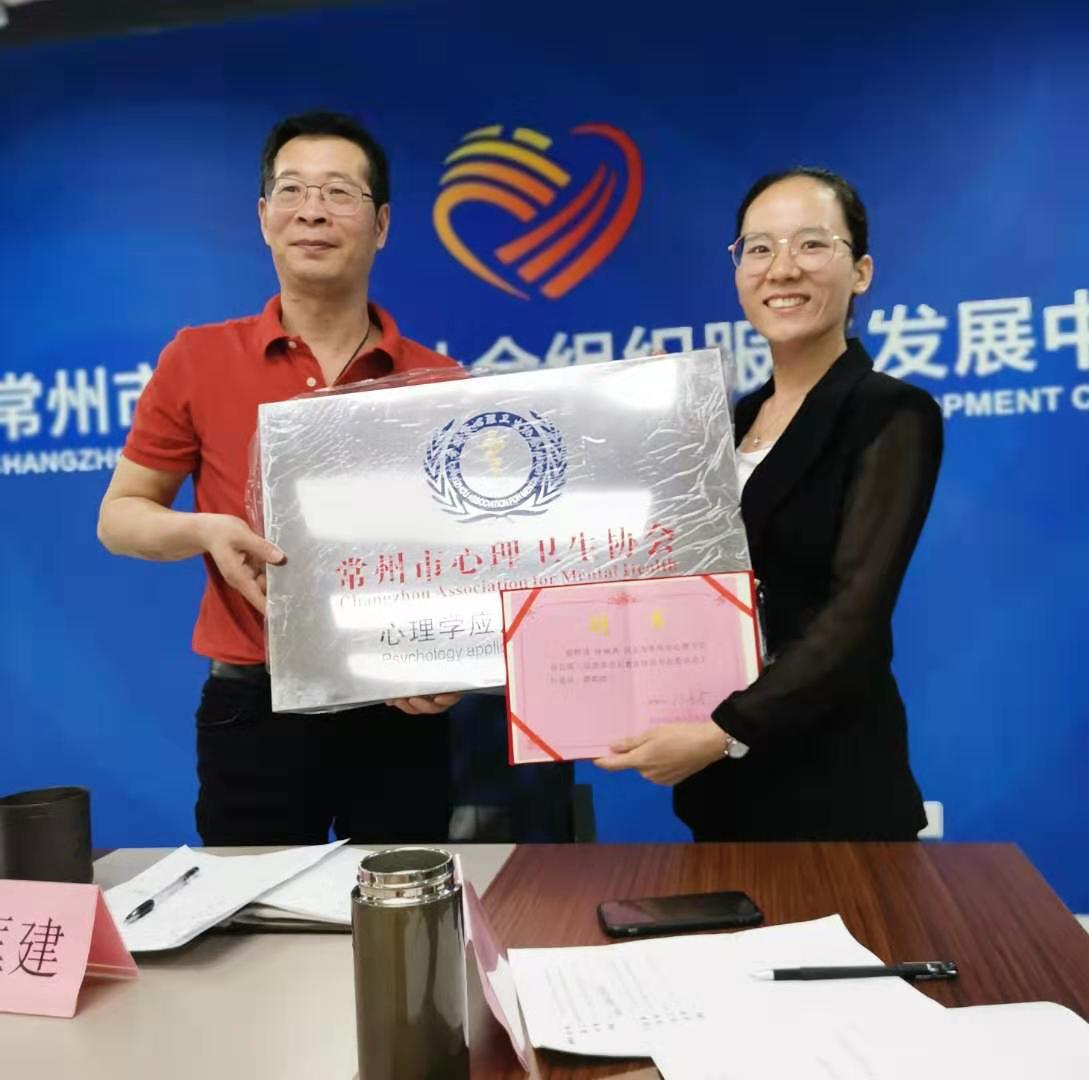 心协理事长孔匡建为后教育培训工作委员会主任委员徐婉燕颁发聘书和铜牌。