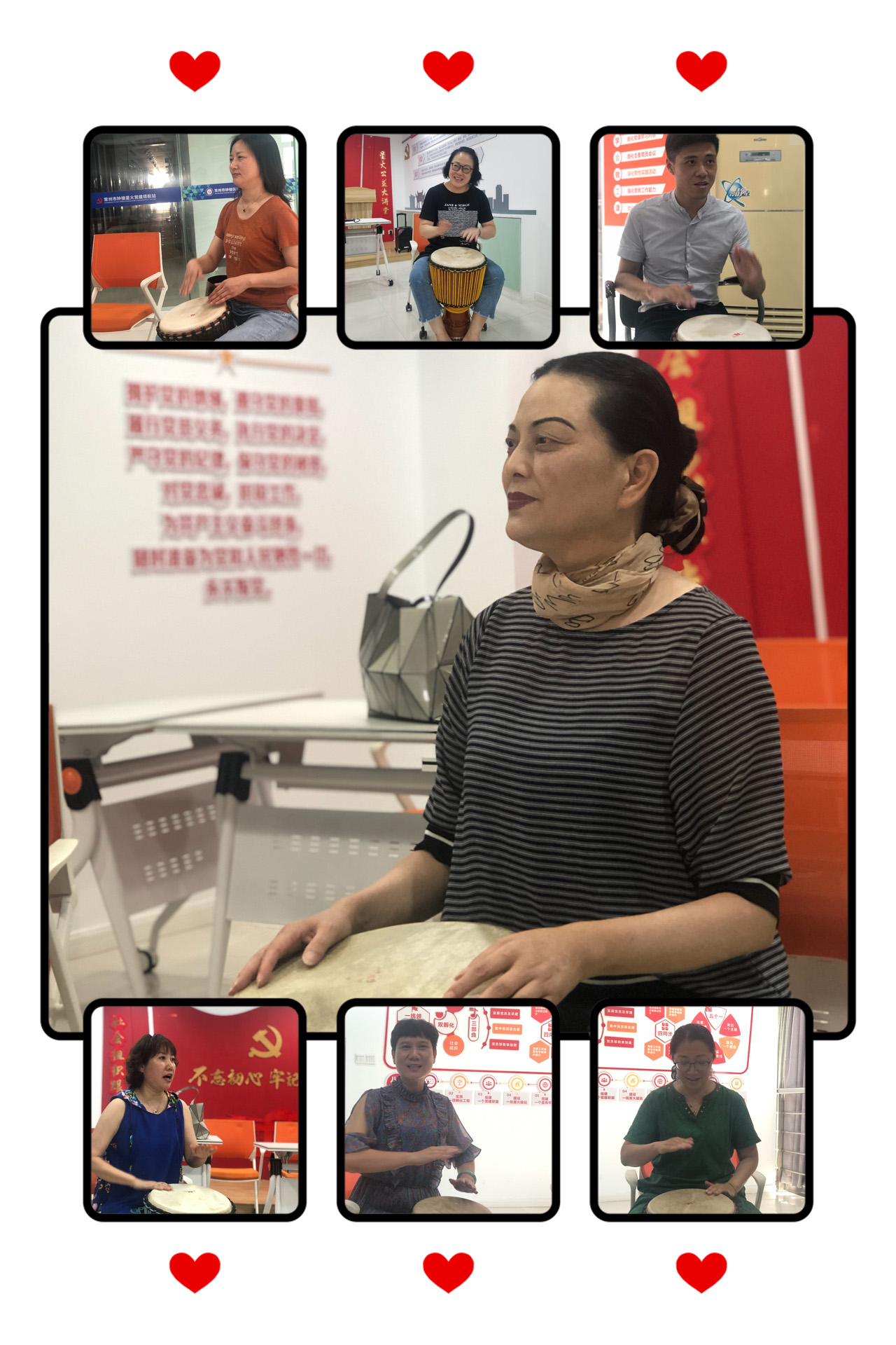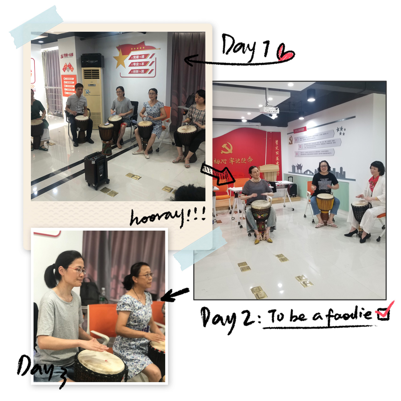 王老师和马老师都是牺牲自己的休息时间,把繁琐的曲子转换为通俗易懂的节奏来指导我们,尽量让我们这些不同年龄层次,缺乏音乐天赋的志愿者老师们少走弯路。她们亲切、可爱、积极、和蔼,有耐心,始终鼓励我们的点点进步,所以我们的鼓声也是越敲越响。每次2个小时的时间都感觉过的特别的快。下课后,很多志愿者老师都依依不舍。