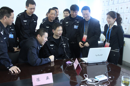 在场的每位民警都在争先恐后地参加训练,图为两分钟就成功完成抗干扰训练者,大家都对他的抗干扰能力赞许有加。
