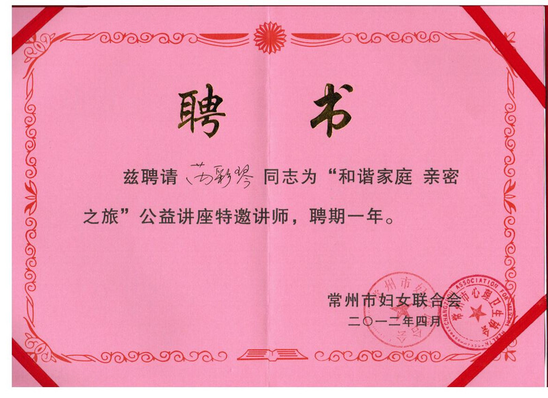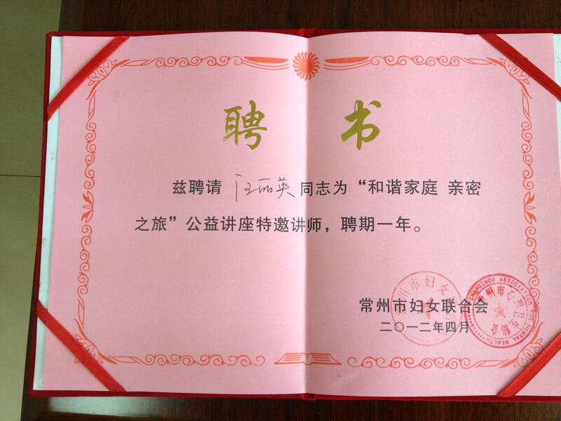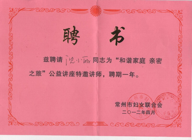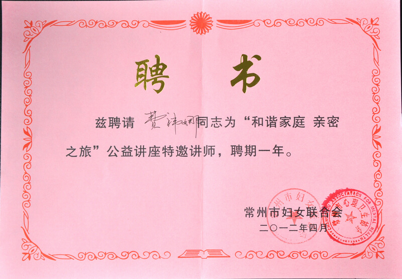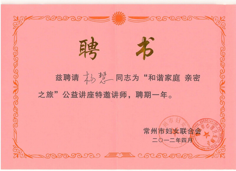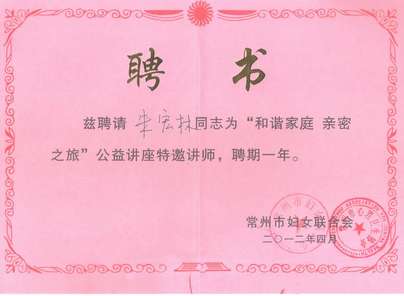 “和谐家庭·亲密之旅”公益讲座特邀讲师聘书