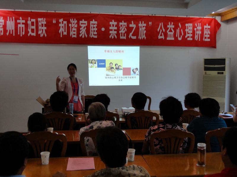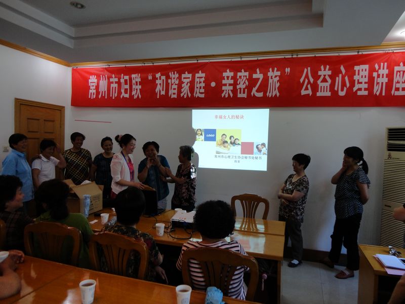 常州市心理卫生协会秘书处陈亚老师今天为某社区上了一堂《幸福女人的秘诀》公益讲座,首先做了一个游戏,因为听课的人比较多所以击鼓传花传了10位阿姨上台一起做游戏,在场的不管是在做游戏的还是看游戏的一个个都笑得前仰后合的,连下面一楼的人都听到了楼上的动静。游戏后大家都学到了人在最困难的时候也一定要记得只有幽默才能保持乐观!游戏结束后,陈老师将幸福女人秘诀教给了在场的每一位,希望大家都做个非常幸福的女人,一起幸福到永远!