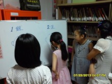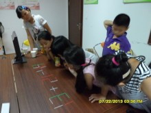 7月22日下午2点,天气燠热。一群来自单亲贫困家庭的小朋友汇聚在红梅街道红西社区居委会图书室,参加天宁行动小组组织的题为“益智有趣的暑期游戏让大家更快乐”的室内游戏。游戏活动开始前,小朋友被分成两组,由抢答脑筋急转弯题作为预热,一阵欢笑之后,即以扑克牌计算24点、下五子棋、移动塑料棒平衡不等式、蒙眼作画等为小朋友们喜闻乐见的游戏形式逐步推进。如下五子棋时规定,小朋友要分组交错并每人依次轮流出棋,想到不得商量。这种既有合作又有对抗的游戏,由于棋局不断变化,每人的出棋质量直接影响着本组的胜负,因此,小朋友们感到新鲜而兴奋,面对棋盘显得很专注,有的在投子时表现谨慎,给人留下深刻印象国。在蒙眼作画游戏中,赵语韵拉下面罩,打量着自己的“杰作”,先是有些狐疑,继而忍俊不禁,最后竟捧腹大笑,逗得大家不亦乐乎。