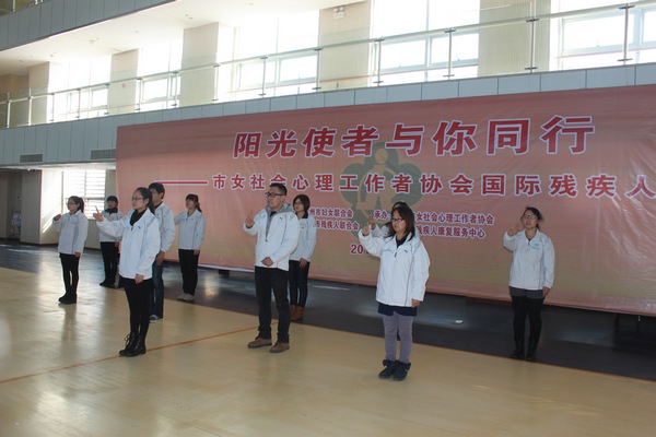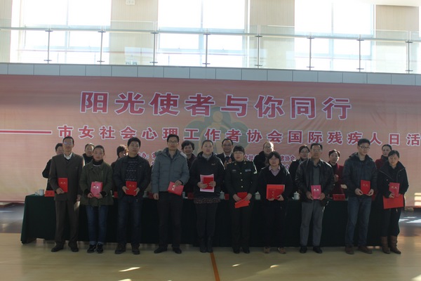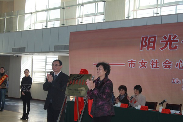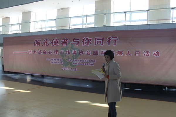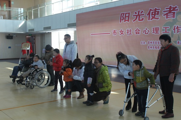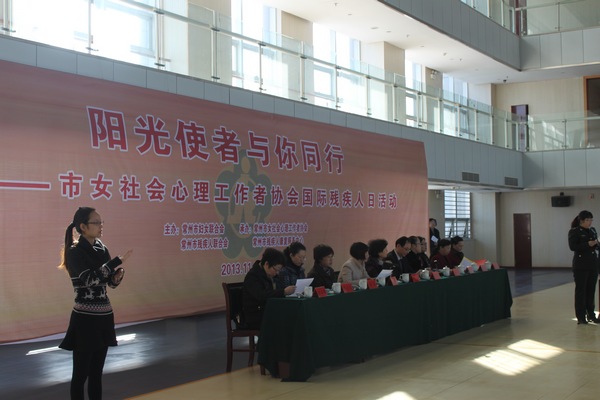 活动由常州市妇联副主席孙惠主持,首先由常州市妇联主席周广菊、常州市残联理事长金志达为“常州市女社会心理工作者协会公益服务基地”揭牌。然后常州市女社会心理工作者协会会长朱坚介绍了常州市首批10位“阳光使者”,并为他们颁发了证书,常州市女社会心理工作者协会副会长王京带领“阳光使者”宣誓。常州市残联理事长金志达和“阳光使者”代表解放军102医院心生医学科主任杨春做了重要发言。